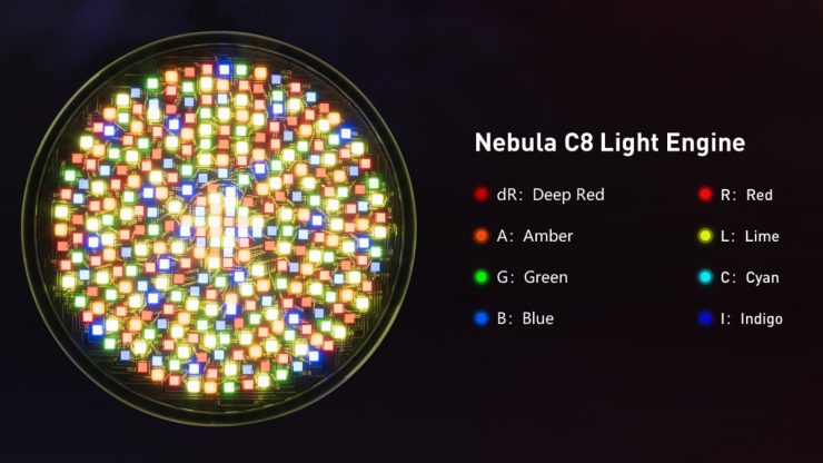 The Nebula C8 uses eight LED colors instead of three or four, allowing it to cover more of the visible spectrum and produce smoother, more accurate light.